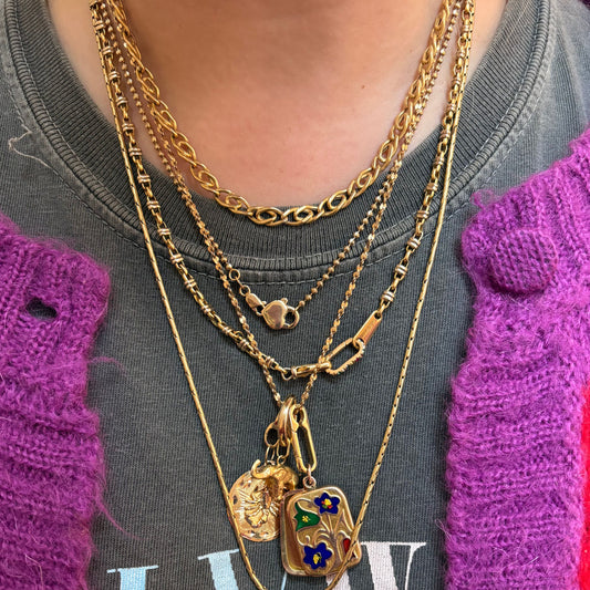 First of all I have to say CNOJ’s live shows are so fun and they have so much cool jewelry. I recently bought their mariner chain, a connector, and a key charm during a couple of their live shows and I love them. The connector is so versatile and sturdy. The key charm is adorable and the perfect size. As for the 20” mariner chain, I was originally looking for something wider (around 3-4mm) but the 2.3mm turned out to be exactly what i needed especially for my skinny neck. It’s very substantial in weight (around 7gr) and feels really nice and solid. I hope to find more treasures from them in the future! Pictured are the mariner chain and the connector attached to it (with some charms) and the key charm is on the chain above.