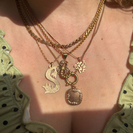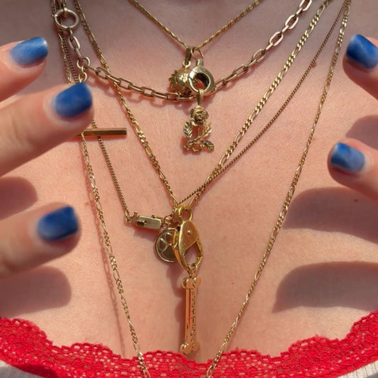 First of all I have to say CNOJ’s live shows are so fun and they have so much cool jewelry. I recently bought their mariner chain, a connector, and a key charm during a couple of their live shows and I love them. The connector is so versatile and sturdy. The key charm is adorable and the perfect size. As for the 20” mariner chain, I was originally looking for something wider (around 3-4mm) but the 2.3mm turned out to be exactly what i needed especially for my skinny neck. It’s very substantial in weight (around 7gr) and feels really nice and solid. I hope to find more treasures from them in the future! Pictured are the mariner chain and the connector attached to it (with some charms) and the key charm is on the chain above.