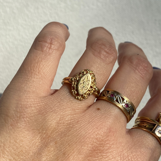 I purchased this signet ring from a live sale on Instagram. It is prettier in person than any online photograph. The moment I got it, I put it on my hand and it hasn’t come off since!