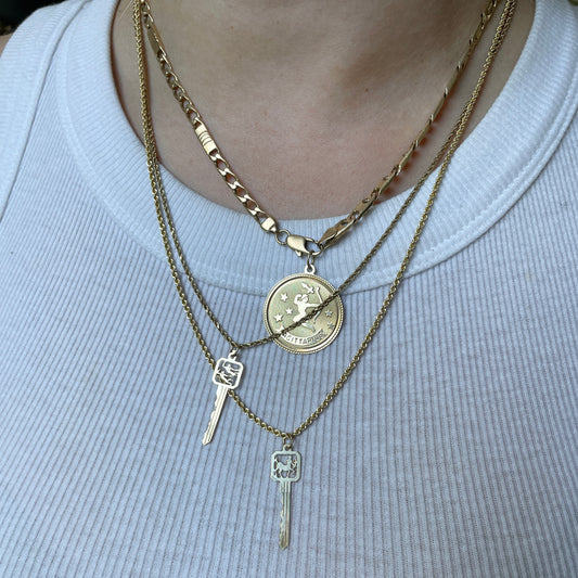 First of all I have to say CNOJ’s live shows are so fun and they have so much cool jewelry. I recently bought their mariner chain, a connector, and a key charm during a couple of their live shows and I love them. The connector is so versatile and sturdy. The key charm is adorable and the perfect size. As for the 20” mariner chain, I was originally looking for something wider (around 3-4mm) but the 2.3mm turned out to be exactly what i needed especially for my skinny neck. It’s very substantial in weight (around 7gr) and feels really nice and solid. I hope to find more treasures from them in the future! Pictured are the mariner chain and the connector attached to it (with some charms) and the key charm is on the chain above.