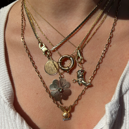 First of all I have to say CNOJ’s live shows are so fun and they have so much cool jewelry. I recently bought their mariner chain, a connector, and a key charm during a couple of their live shows and I love them. The connector is so versatile and sturdy. The key charm is adorable and the perfect size. As for the 20” mariner chain, I was originally looking for something wider (around 3-4mm) but the 2.3mm turned out to be exactly what i needed especially for my skinny neck. It’s very substantial in weight (around 7gr) and feels really nice and solid. I hope to find more treasures from them in the future! Pictured are the mariner chain and the connector attached to it (with some charms) and the key charm is on the chain above.