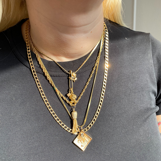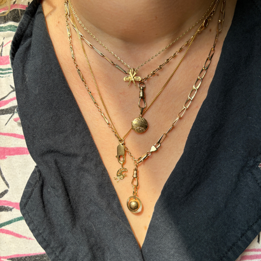 First of all I have to say CNOJ’s live shows are so fun and they have so much cool jewelry. I recently bought their mariner chain, a connector, and a key charm during a couple of their live shows and I love them. The connector is so versatile and sturdy. The key charm is adorable and the perfect size. As for the 20” mariner chain, I was originally looking for something wider (around 3-4mm) but the 2.3mm turned out to be exactly what i needed especially for my skinny neck. It’s very substantial in weight (around 7gr) and feels really nice and solid. I hope to find more treasures from them in the future! Pictured are the mariner chain and the connector attached to it (with some charms) and the key charm is on the chain above.