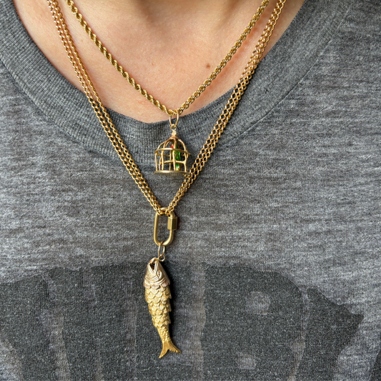 First of all I have to say CNOJ’s live shows are so fun and they have so much cool jewelry. I recently bought their mariner chain, a connector, and a key charm during a couple of their live shows and I love them. The connector is so versatile and sturdy. The key charm is adorable and the perfect size. As for the 20” mariner chain, I was originally looking for something wider (around 3-4mm) but the 2.3mm turned out to be exactly what i needed especially for my skinny neck. It’s very substantial in weight (around 7gr) and feels really nice and solid. I hope to find more treasures from them in the future! Pictured are the mariner chain and the connector attached to it (with some charms) and the key charm is on the chain above.