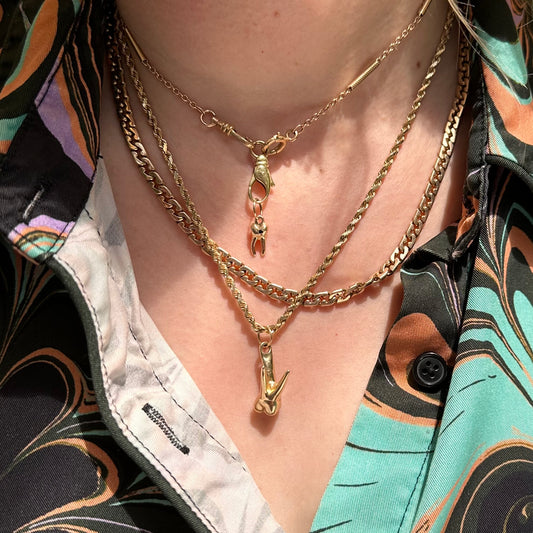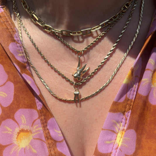 First of all I have to say CNOJ’s live shows are so fun and they have so much cool jewelry. I recently bought their mariner chain, a connector, and a key charm during a couple of their live shows and I love them. The connector is so versatile and sturdy. The key charm is adorable and the perfect size. As for the 20” mariner chain, I was originally looking for something wider (around 3-4mm) but the 2.3mm turned out to be exactly what i needed especially for my skinny neck. It’s very substantial in weight (around 7gr) and feels really nice and solid. I hope to find more treasures from them in the future! Pictured are the mariner chain and the connector attached to it (with some charms) and the key charm is on the chain above.