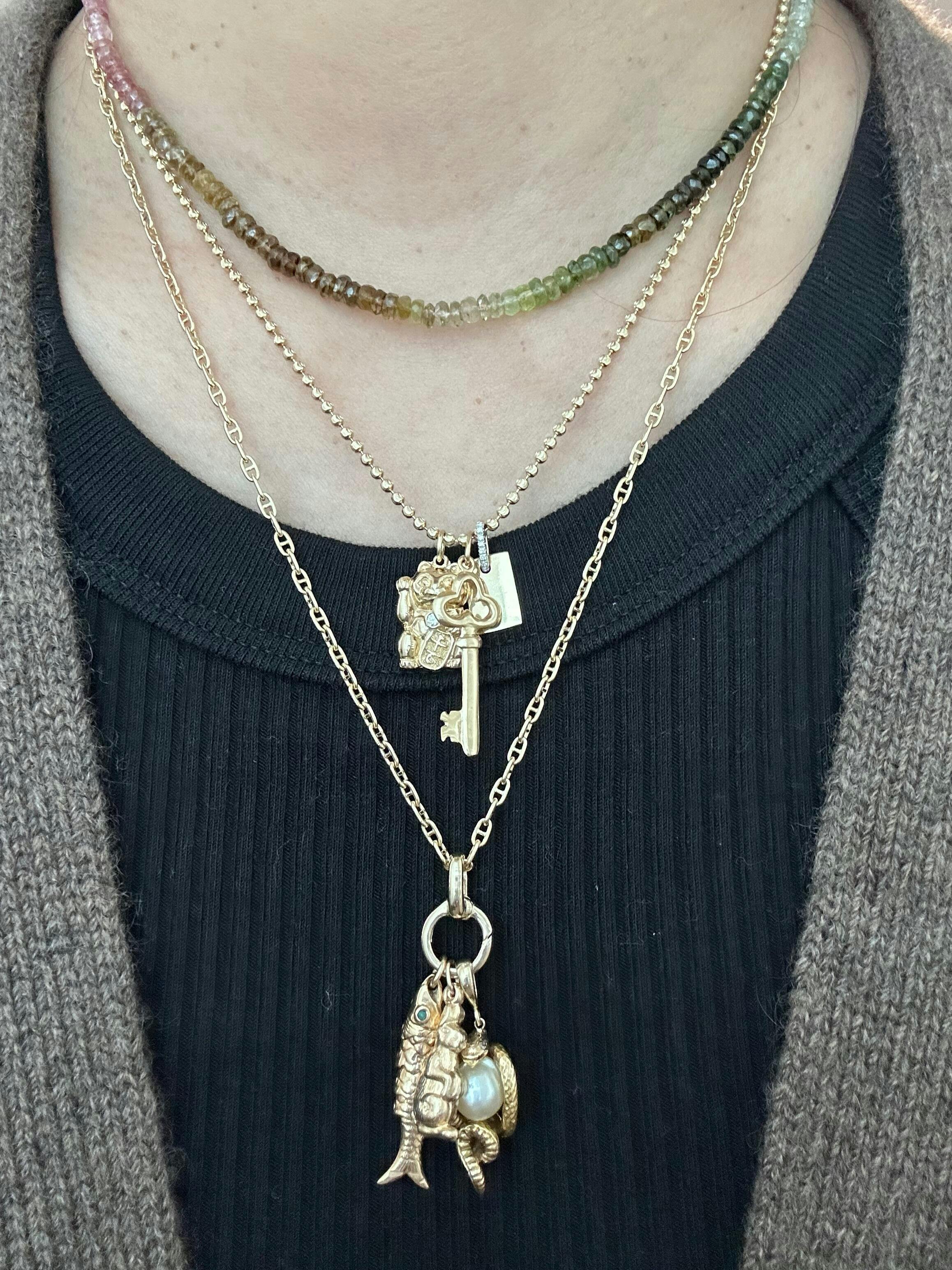 First of all I have to say CNOJ’s live shows are so fun and they have so much cool jewelry. I recently bought their mariner chain, a connector, and a key charm during a couple of their live shows and I love them. The connector is so versatile and sturdy. The key charm is adorable and the perfect size. As for the 20” mariner chain, I was originally looking for something wider (around 3-4mm) but the 2.3mm turned out to be exactly what i needed especially for my skinny neck. It’s very substantial in weight (around 7gr) and feels really nice and solid. I hope to find more treasures from them in the future! Pictured are the mariner chain and the connector attached to it (with some charms) and the key charm is on the chain above.