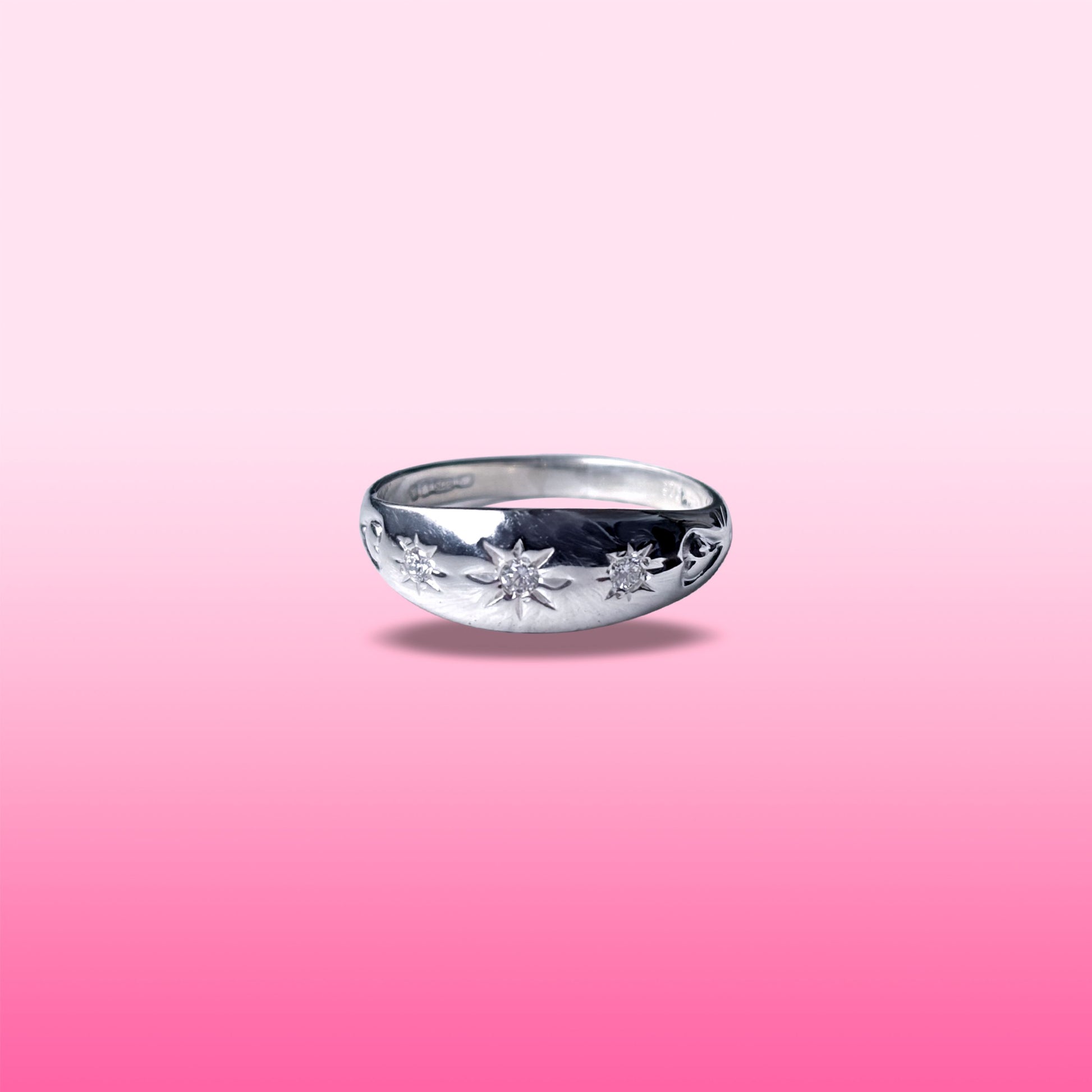 This cloned beauty comes from the UK. Original marks indicate she was 9 carat and assayed in London in 1984. The design was super popular in the Edwardian era in the UK and was known as the Gypsy ring. This babe was a reincarnation of that style. The heart and bow engraving on the shoulders is the obvious 80s touch.