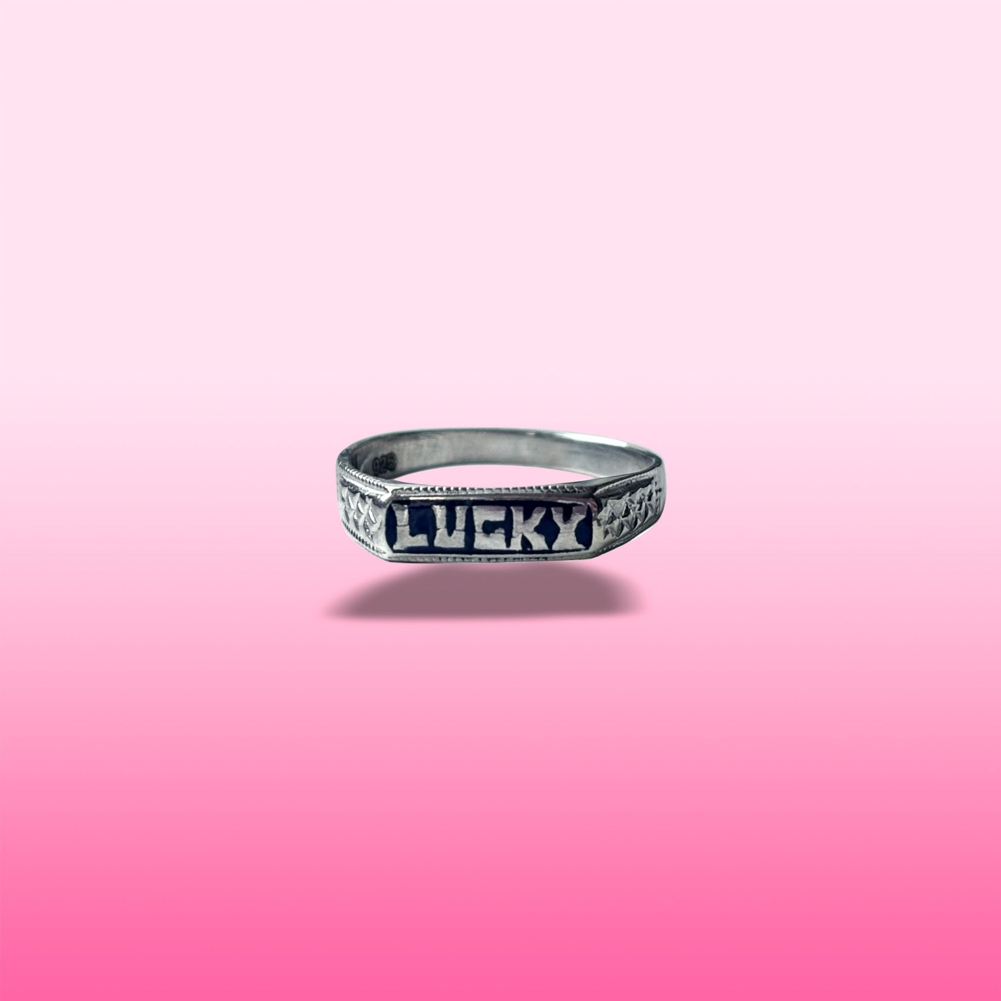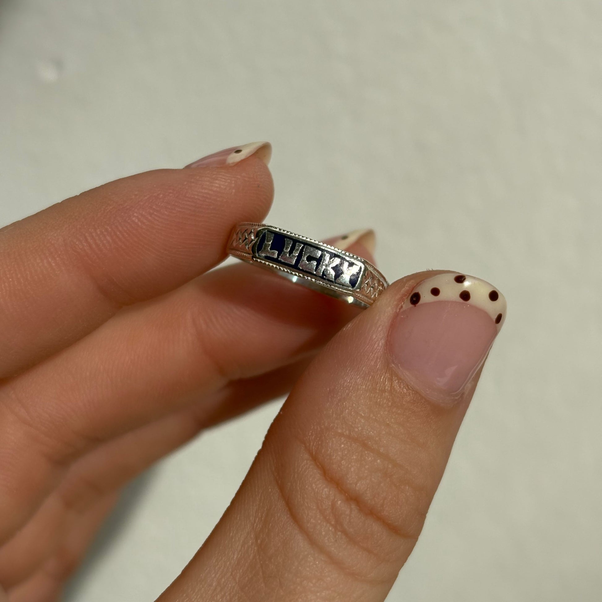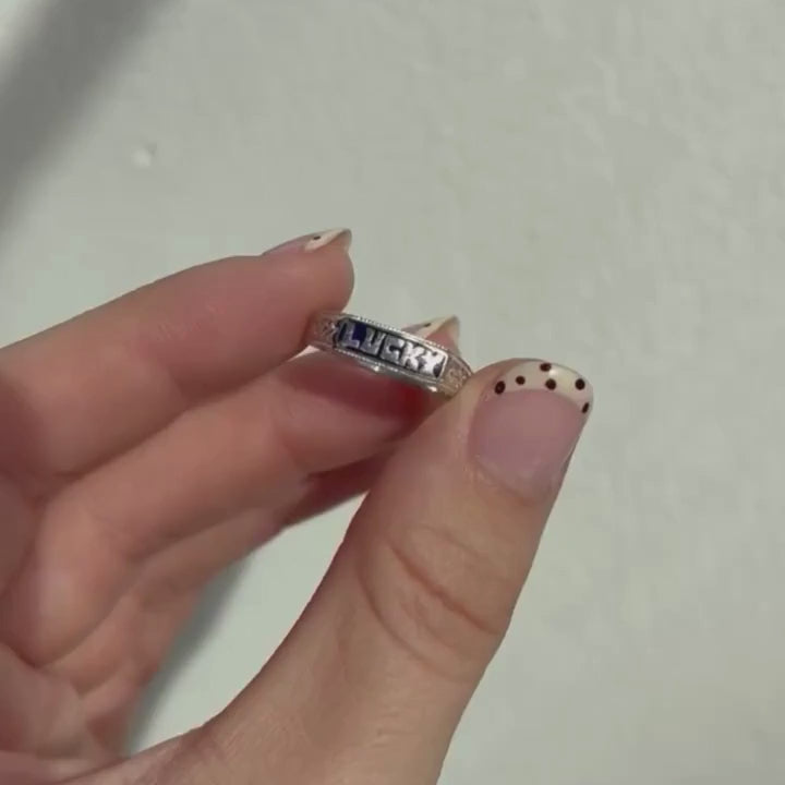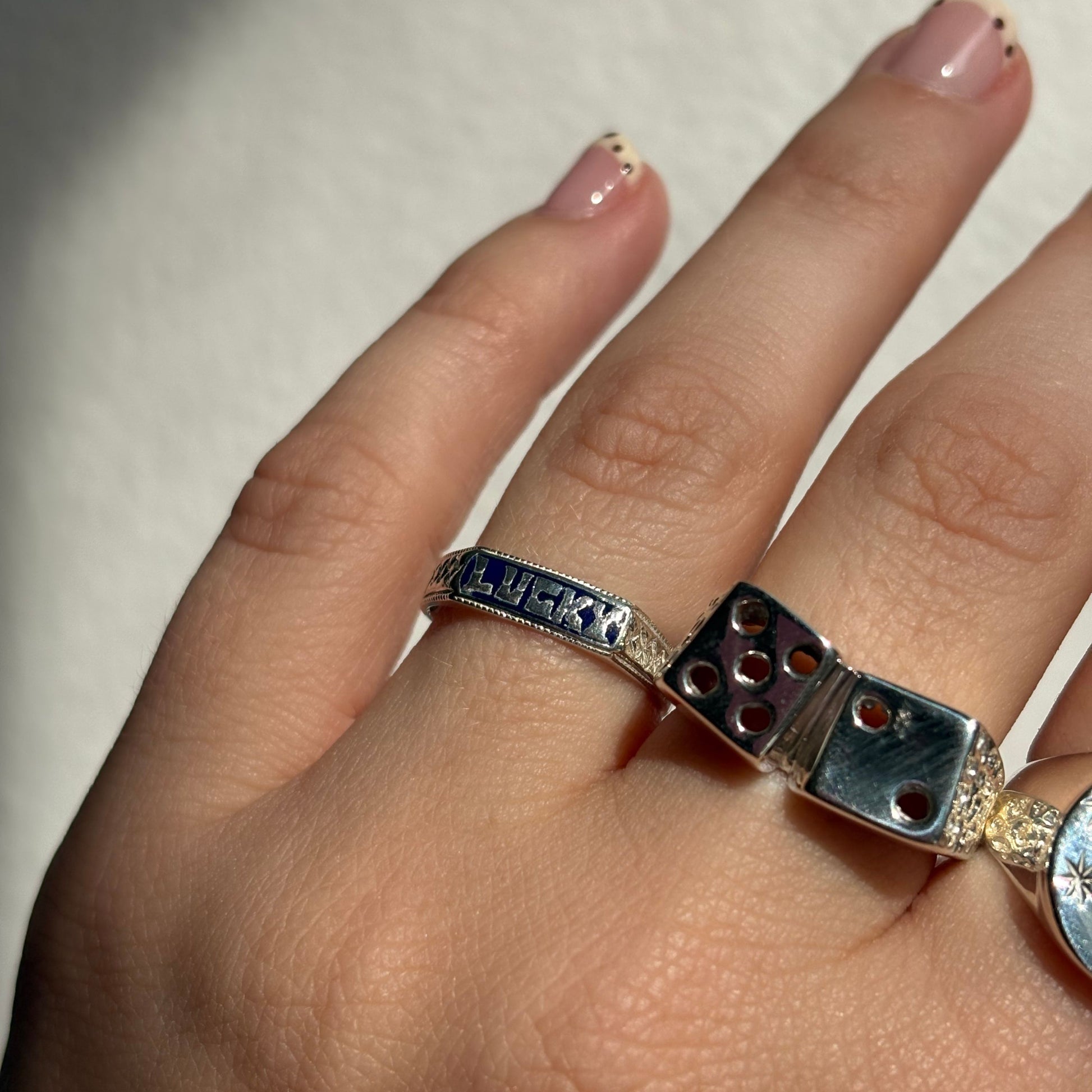 Blue enamel, milgrain engraved edge, perfect stacking width and lots of luck to boot. Original was found in the gold scrap pile. Available in 14k in rose and yellow gold and now in silver.