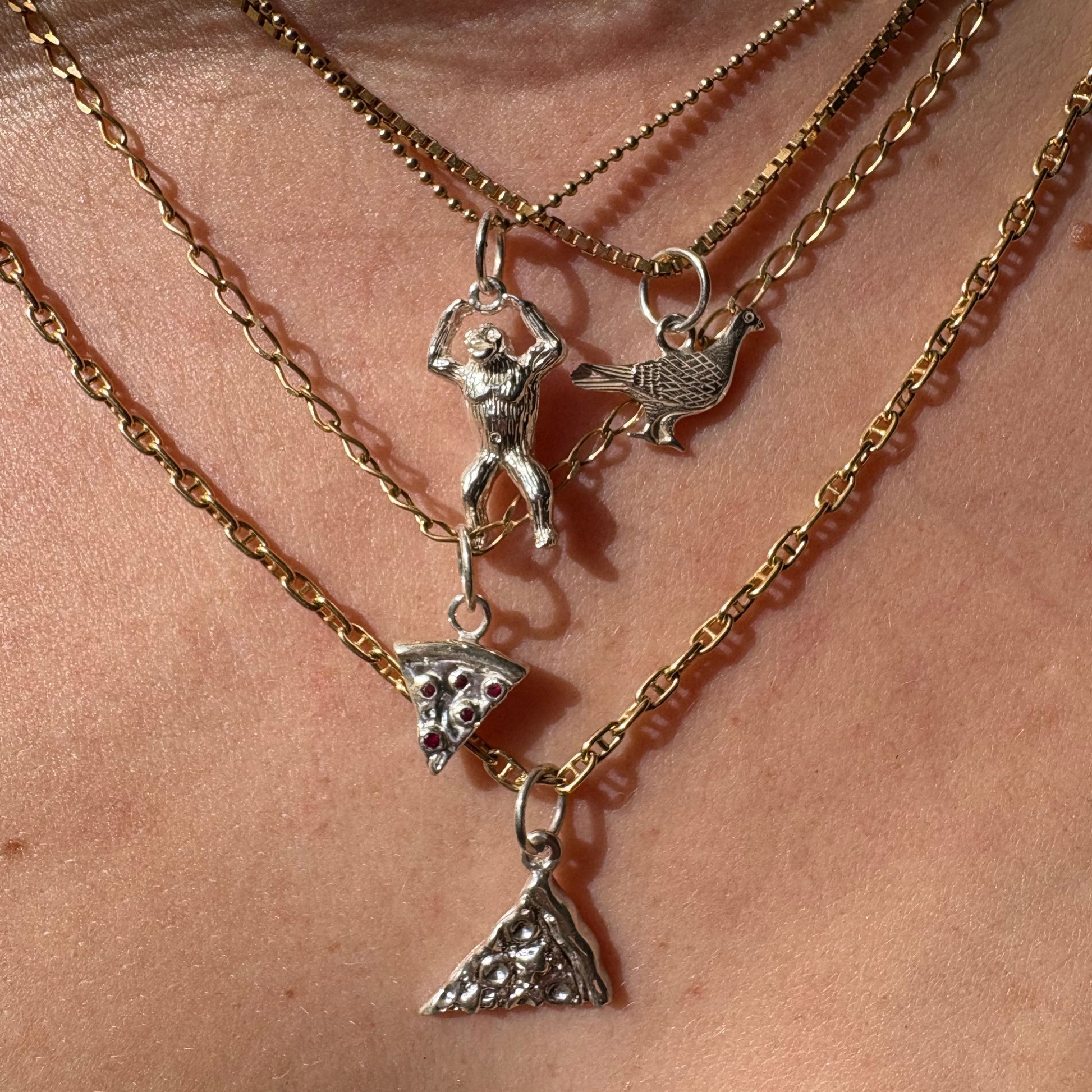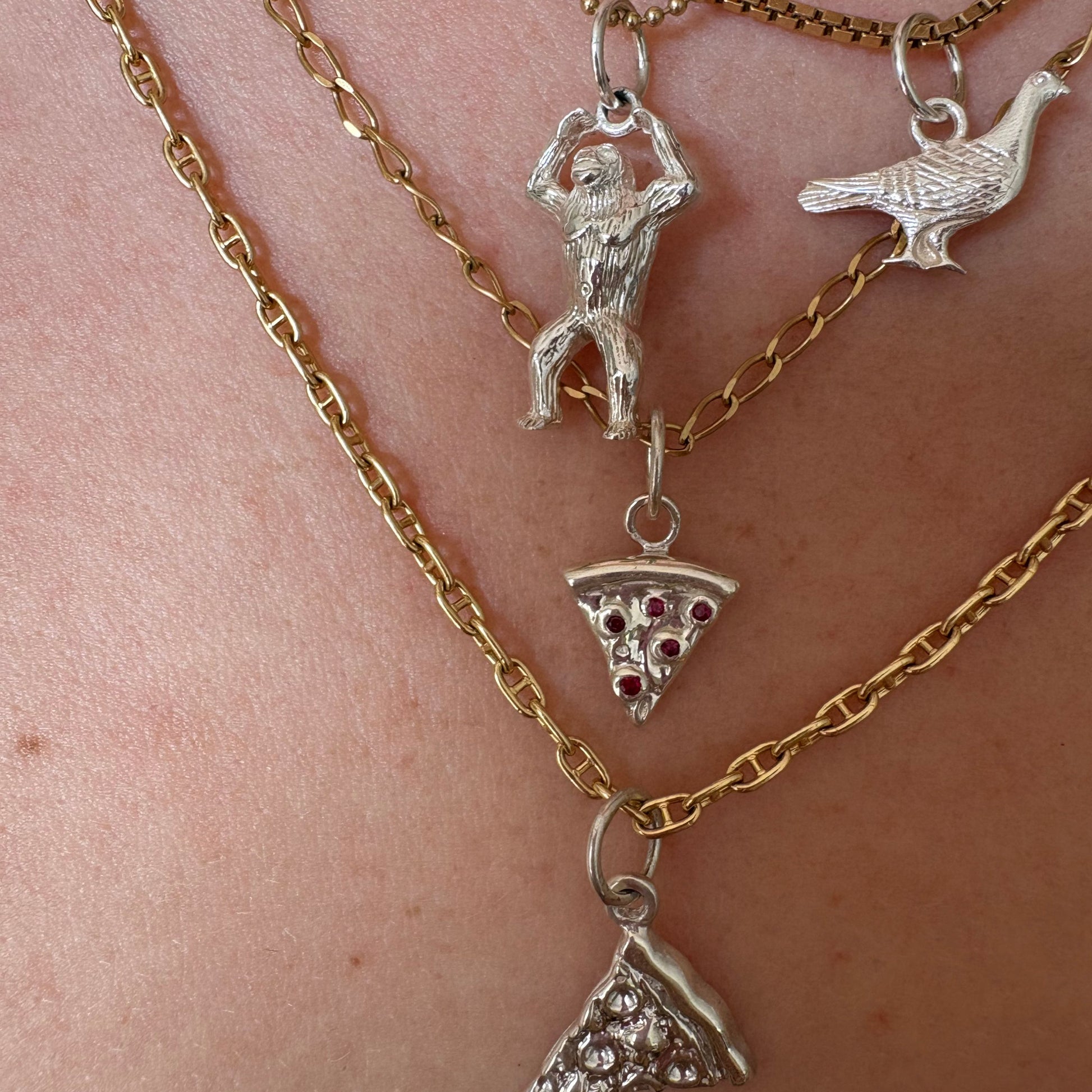 This baby pizza was cloned from a 90s silver charm & we gave her those rubies to highlight the iconic NY pepperoni slice.